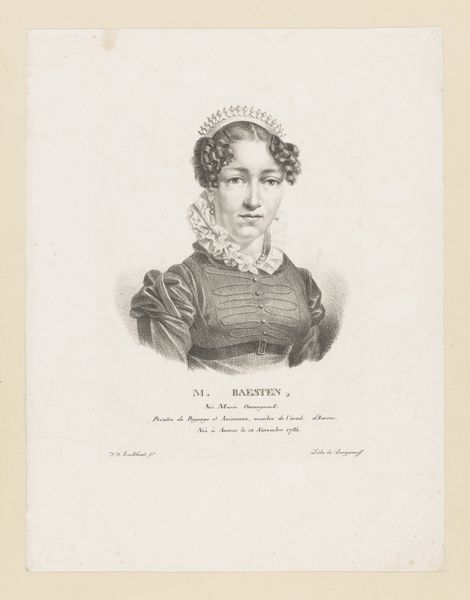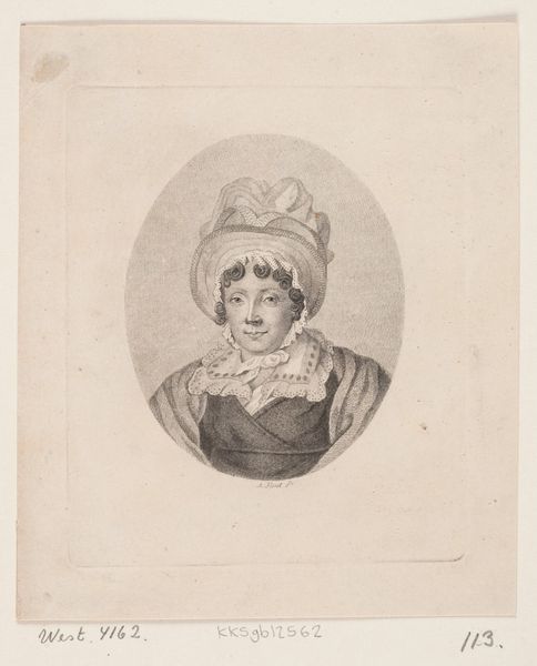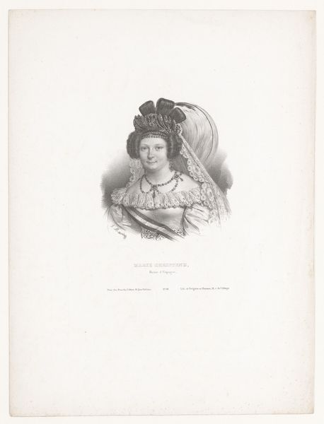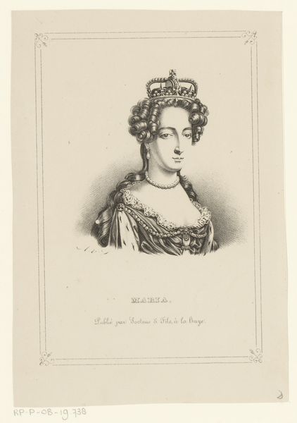 Curator: We're looking at a stipple engraving titled "Mary Stuart, At the age of Sixteen", a print created in 1844. Editor: The contrast of the fine lines makes her seem quite fragile and reserved, despite the opulent dress. A poised stillness radiates from the image. Curator: Indeed. As a stipple engraving, the tonality is built up with dots rather than lines, which contributes to that softer, more delicate effect. It was based on an original portrait and reproduced for "Memoirs of Eminent Englishwomen." This places it firmly within a visual culture aimed at the consumption and moral instruction of women, framed within notions of British national identity. Editor: Looking closely at the image’s formal structure, I see how her ornate ruff and elaborate headdress visually enclose her face, heightening the sense of constraint and emphasizing her youth and apparent vulnerability, like she's been staged or confined. Even the details of her pearl necklace contribute to this feeling of being adorned, almost trapped by embellishments. Curator: Exactly. The artist, Joseph Brown, strategically employs symbolism—her attire broadcasts both her noble status and, implicitly, the burden of responsibility placed on her as a future queen during a volatile time. It suggests much about 19th-century Britain's fascination with figures like Mary Stuart, whose life was filled with conflict. Prints such as this kept her legacy alive within a domestic context. Editor: I hadn't considered it, but now that you mention it, even her almost wistful expression—captured in a series of carefully placed dots—seems staged, ready to face whatever comes next, yet retaining her demure character. The choice of a reproductive engraving underscores how such images can both document and mythologize a figure, shaping historical memory for contemporary audiences. Curator: Absolutely. The piece truly highlights how social history is often conveyed and encoded by these stylistic choices. Thank you. Editor: It was wonderful to look so closely at these lines, considering how visual elements contribute so much to what we understand of history, one little dot at a time.