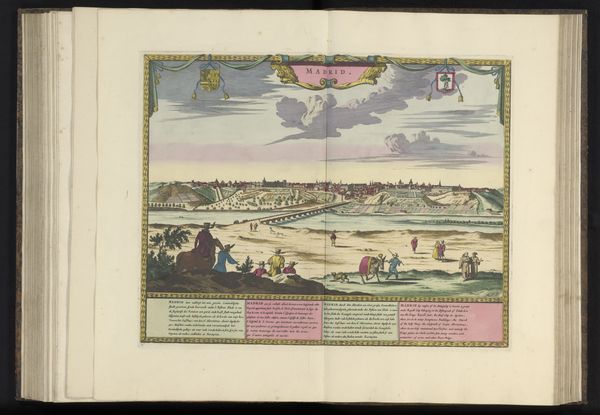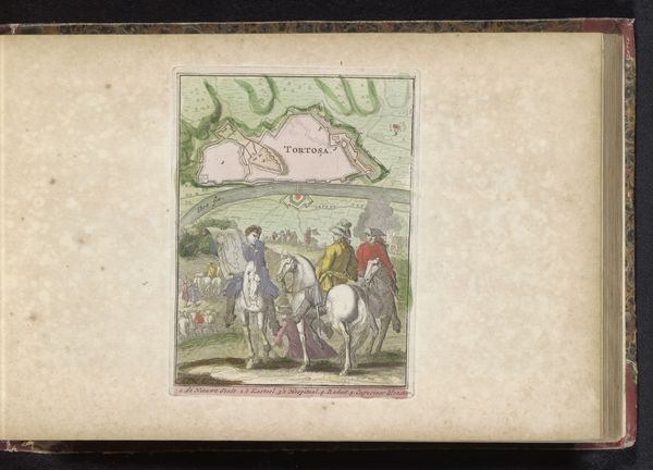 Curator: It looks like an illustration from a historical novel—full of tiny figures bustling about. Editor: Indeed. This is a work titled "Plattegrond van Lérida," made in 1735 by an anonymous artist. It’s a combination of genres, mixing landscape, cartography, and scenes from military life using watercolor and colored pencil. Curator: It’s fascinating how the cartographic aspect takes precedence. The landscape nearly overwhelms the figures down below. Look at how that Segre river snakes around—like a metallic ribbon dividing territories. Editor: Notice the tension in the spatial relationships. The map itself, which occupies the upper half, serves as a kind of omniscient backdrop, while the encampment scene is brought to life in the lower register. The two create a powerful disjunction. Curator: It’s true, there’s something detached and coldly analytical about it. What do you think it expresses? The map makes the events happening in the camp seem almost inconsequential. The real stakes appear to be those lines drawn in the territory above, almost abstract and intellectual in comparison to what’s happening on the ground, literally. Editor: Right. There's a dichotomy created by using two different scales and approaches; the macroscopic overview afforded by the map against the lived, messy reality. It’s as though the artist intended us to meditate on the differences between objective representations and subjective experience. Curator: I like your interpretation. So the artist is prompting us to acknowledge our limited viewpoint. As if to suggest all perspectives are shaped and incomplete. Editor: Perhaps, or to recognize the chasm that invariably separates representation and the 'real'. The flat, depersonalized lines and colors render the human dimension as incidental—as details contained and controlled by the cartographic framework. Curator: All this in one compact rendering. It speaks volumes about our ways of seeing and the choices we make when visually narrating the world around us. Editor: Precisely, prompting further exploration on the dynamics of visual storytelling through a very curious juxtaposition of form and content.