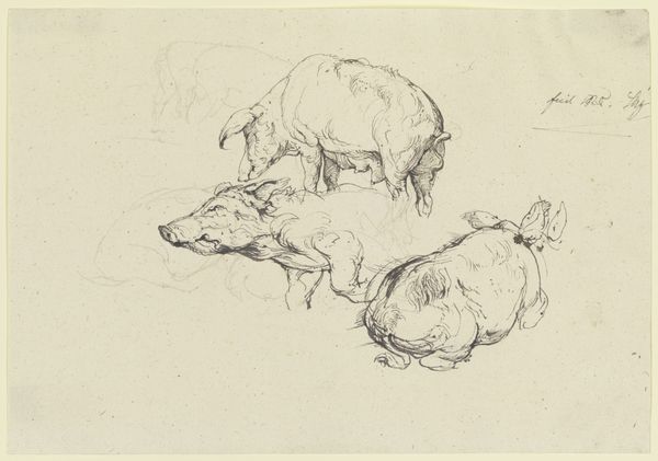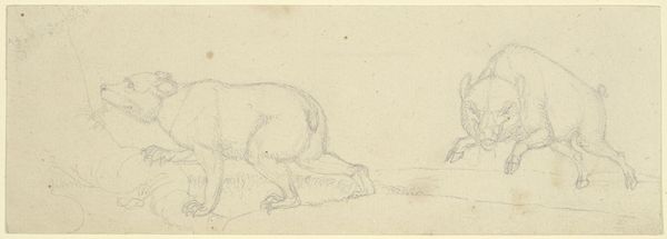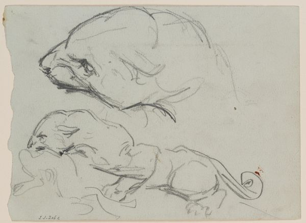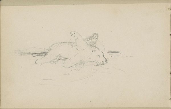 Curator: There's a disarming simplicity to this pencil drawing; almost like a fleeting thought captured on paper. Editor: I see that immediately. It’s the economy of the lines; the work has an immediacy. What can you tell me about the artwork itself? Curator: This drawing, "Path in a Heath Landscape and a Man with a Hat", is by Johannes Tavenraat. Created sometime between 1842 and 1868, it uses delicate pencil work to depict a tranquil scene now held in the collection of the Rijksmuseum. It speaks to the Romantic ideals prevalent at that time. Editor: Ah, Romanticism – a period fascinated by nature and the sublime. What is it about the symbolism here, though, that carries an emotional weight across time, even without any grand display of the sublime? Curator: Perhaps it’s the recumbent figure, the man resting – possibly sleeping – in the landscape. It’s a posture of surrender and merging with nature itself. The figure echoes a shepherd in classical iconography; mankind subsumed within nature's grandeur. The heath landscape itself represents a specific kind of untamed nature that offered solace for burgeoning urban populations. Editor: So the work hints at a deeper dialogue about man’s relationship with nature and progress within society? The lone figure certainly prompts consideration, and a reflection on how the artist viewed social norms during that era. Were representations of solitary figures common during this time, and did this pose particular political sentiments through its social commentary? Curator: Solitary figures became a prominent symbol during the 19th century, particularly during the rise of individualism and an increase in feelings of alienation caused by industrialization and modernization, which suggests a retreat inward towards nature. Here, it’s the path itself that's important, a sort of pilgrimage back to natural ways of being that have roots dating to antiquity. Editor: I'd have never thought the "return to nature" archetype that exists so frequently now would have such deep origins. I think what makes the piece resonant, even now, is its understatement. It does not try to awe; rather, it whispers. Curator: I completely agree; that’s the true charm.