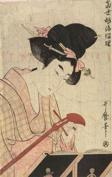 Editor: This is Utagawa Kunimasa's "Actor Segawa MICHINOSUKE AS OSHIZA BUNSO'S WIFE," currently residing at the Harvard Art Museums. The floating fans create such a whimsical feeling, but the actor's gaze feels so direct. What do you see in this piece? Curator: I observe a sophisticated interplay of lines and shapes. Note how the verticality of the figure is subtly countered by the oblique angles of the fans and hair ornaments. The composition achieves balance through asymmetry. Editor: The use of simple shapes really stands out now that you mention it. It's interesting to focus on the abstract elements rather than the figure itself. Curator: Precisely. The formal elements are not merely representational; they construct a self-contained visual system. A semiotician might say the fans are signifiers, less about their literal presence. Editor: Fascinating. I'll definitely be looking at artworks with a new perspective now. Curator: Indeed, a deeper appreciation emerges when we attend to the formal language.