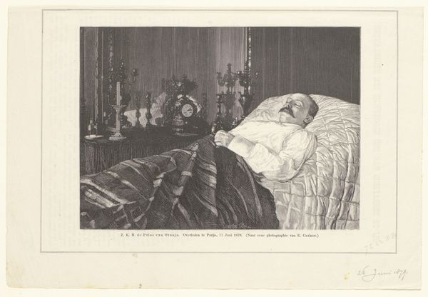 This drawing captures Jonkvrouwe Johanna van Weede on her deathbed, and was made anonymously using pen and brown ink with brown wash. The artist was not aiming for photorealism; rather, they were trying to capture the scene with immediacy and sensitivity. Brown ink and wash, with their warm, sepia tones, evoke a sense of solemnity and quiet reflection, appropriate for the subject. The drawing's materiality is simple, a stark contrast to the opulence that might have surrounded Jonkvrouwe van Weede in life. It’s a reminder that in death, all are rendered equal, recorded with the same humble materials. The pen lines define the forms, while the wash adds depth and shadow, creating a soft, muted effect, while the attention to detail, from the lace on her cap to the floral pattern on her blanket, speaks to the importance of documenting every aspect of her final moments. The artwork, in its simplicity, transcends the boundaries of fine art, becoming a poignant record of a human life, underlining the significance of materials, making, and context.