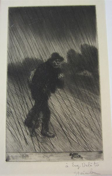 Théophile Alexandre Steinlen likely produced this print of a vagabond in the rain in France, sometime in the late 19th or early 20th century. It’s a poignant image, capturing the bleakness of poverty amidst the backdrop of urban life. Steinlen was deeply engaged with the social realities of his time. As an artist associated with the bohemian cabaret Le Chat Noir, he often depicted the lives of the working class and marginalized individuals. Here, the rain becomes a metaphor for the harsh conditions they faced, reflecting the rapid industrialization and urbanization of France during that period. The figure, hunched and struggling against the elements, embodies the vulnerability of those left behind by progress. Prints like this one were often circulated in periodicals, offering a form of social commentary accessible to a wide audience. To fully understand Steinlen's work, we can consult sources of the period like newspapers, pamphlets, and government reports on poverty and social conditions. These resources help us understand the artist's own views within the broader cultural and institutional context of the time.