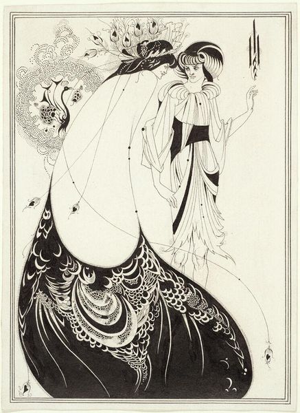 Curator: Looking at Beardsley’s frontispiece for ‘Venus and Tannhauser,’ made in 1895 with ink and pen, what strikes you most about it? Editor: It's incredibly intricate! The stark contrast between the black ink and the white paper gives it a dramatic flair. I'm interested in understanding the labor and the materials used in its making and the penwork. What kind of social and cultural context are we looking at here that emphasizes this medium and means of production? Curator: Beardsley was very deliberate in his choice of materials and technique. The use of ink and pen wasn’t just practical; it was a statement. He elevated the status of printmaking and drawing at a time when painting was still seen as the superior art form. He deliberately engaged with commercial processes and printed formats – what does that signal to you about Beardsley’s artistic intentions? Editor: It suggests he's challenging the elitist nature of the art world by embracing more accessible mediums, questioning the hierarchy between "high" art and commercially viable illustrations. His images get spread more easily! Is the process of mass production almost as much as his subject matter here? Curator: Precisely. His prints, due to their reproducibility, became widely disseminated. Beardsley subverted notions of originality and preciousness often associated with unique artworks. Think about the decorative program. The elaborate borders, the stylized figures…how do these stylistic elements contribute to a broader understanding of the piece's socio-cultural context? Editor: I guess they connect the drawing to Art Nouveau and Symbolism movements, making it accessible as design in book illustration but still having the high-art connection to themes such as the "femme fatale," decadence, and maybe sexual freedom. That tension seems built into the materials themselves! I hadn't really considered it like that before. Thanks. Curator: Material choices aren't innocent decisions; they actively participate in larger cultural dialogues. Always remember that materiality reflects labour and can reflect challenges to hierarchies of value.