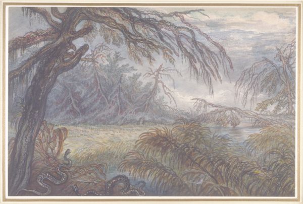 In 1832, Swiss artist Karl Bodmer, age 23, found himself in Indiana with time on his hands. The German naturalist Prince Maximilian of Wied-Neuwied had hired Bodmer to record his expedition up the Missouri River, but the prince got sick in New Harmony, Indiana. While he recuperated, Bodmer explored the mouth of the Fox and Wabash rivers. This watercolor captures an almost primeval shoreline overhung with ghostly bark and rapacious roots, along with a romantic vista of wading cattle. Elements of this scene became the basis for an aquatint published in Maximilian’s book Travels in the Interior of North America (1839-43).