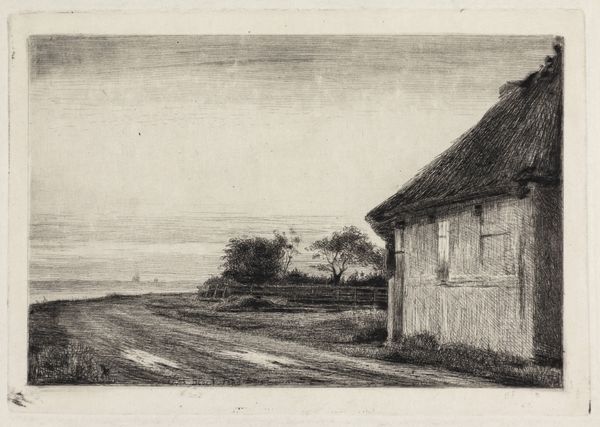 Carl Bloch created this etching, “Huset og haven ved havet,” or “The House and Garden by the Sea,” at an unknown date. The image shows a modest thatched-roof dwelling beside a shoreline, rendered in delicate lines. This print speaks to a rising interest in rural life and the everyday experiences of ordinary people during the 19th century in Denmark. Consider the historical context, where industrialization and urbanization were beginning to transform European societies. Artists like Bloch, trained in the academic tradition, were also seeking new subjects beyond historical or mythological scenes. This shift reflects a broader cultural movement toward valuing the local and the authentic. The etching may seem simple, but it embodies a conscious choice to depict the unadorned beauty of the Danish countryside. By studying the landscapes and social conditions of the time, we can better understand the artistic choices made and how they reflect broader cultural values.