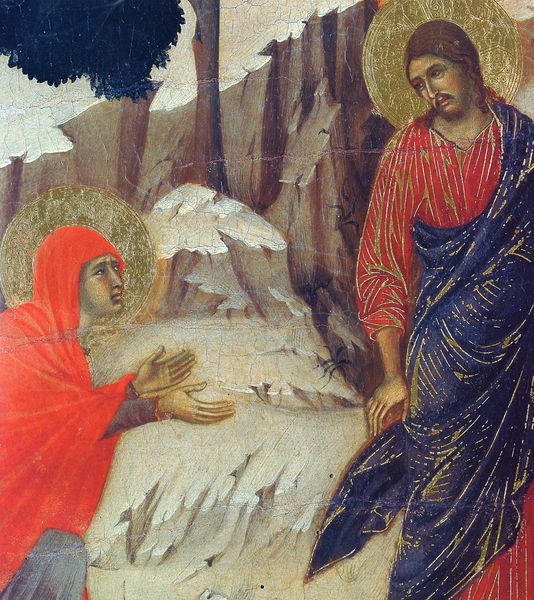 Editor: Here we have Duccio's "The Three Marys at the Tomb," painted around 1311 using tempera. It’s striking how the figures are arranged—almost like a stage play. What catches your eye, looking at this piece? Curator: Formally, I’m drawn to how Duccio manipulates space and color. Observe the rigid lines defining the tomb against the softer, more flowing drapery of the figures. There is a deliberate juxtaposition of the geometric with the organic. Note, also, the artist’s use of contrasting hues, specifically the vibrant reds against the cooler blues and greens, which serve to direct the viewer’s eye, and creates an engaging surface dynamism. Editor: It does feel like everything is carefully positioned. How do you interpret that staging? Curator: This compositional control leads us to consider the work’s semiotic construction. Each element is strategically placed. Ask yourself, what does it mean to see the figures arranged thus, and what narratives are formed within the artwork's geometry? The narrative of the painting can be revealed through careful considerations of the relationships between form and meaning. Editor: That makes sense. The figures aren't just placed randomly. It's all contributing to the story and meaning. I hadn't considered the formal aspect playing such a central role. Curator: Indeed, it invites us to analyze art not just for what it depicts, but how its elements interact to construct meaning. Hopefully, that opens up new interpretative avenues to explore, encouraging a shift from viewing art as representational towards it being appreciated as a constructed sign system.