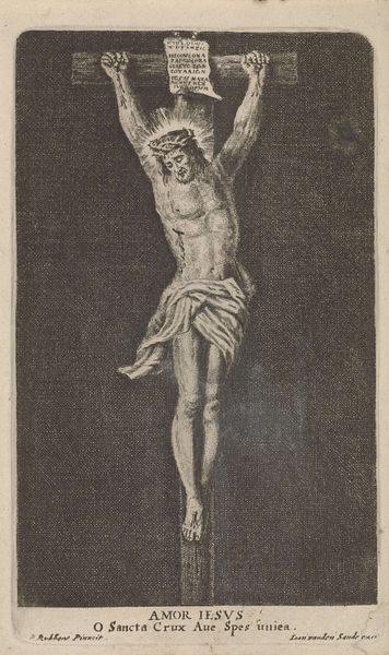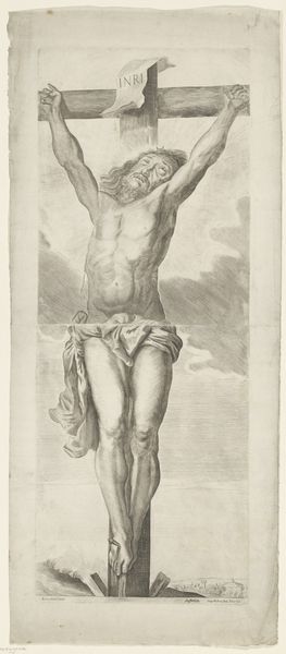 Pieter de Bailliu created this engraving, Christus aan het kruis, sometime in the 17th century. As an artist working in the Netherlands, he was entrenched in a society grappling with religious reform and its impact on daily life. This depiction of Christ on the cross is more than a religious symbol; it's a lens through which we can examine the intersections of faith, power, and identity in the 17th century. Look at the suffering etched into Christ's face, the physical strain evident in his body. In that era, the church was a powerful political entity, and images like these were not just about spiritual reflection; they were also tools of influence, capable of shaping the viewer's emotional and ideological understanding. In a society marked by strict social hierarchies, religious artworks often served to reinforce established power structures. Yet, there's also something deeply personal in this image – a raw portrayal of human suffering that transcends the religious narrative. It prompts us to reflect on the cost of sacrifice.