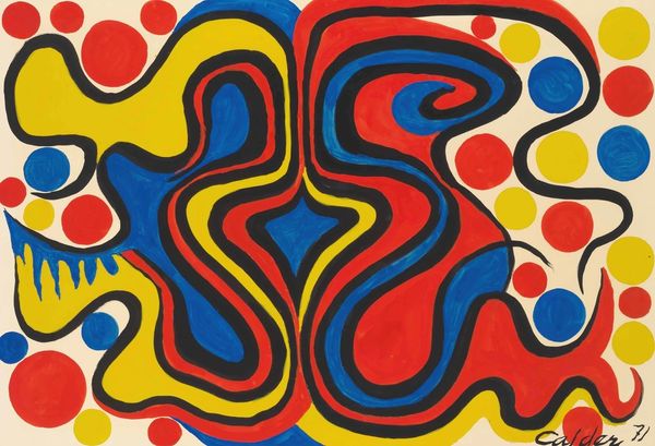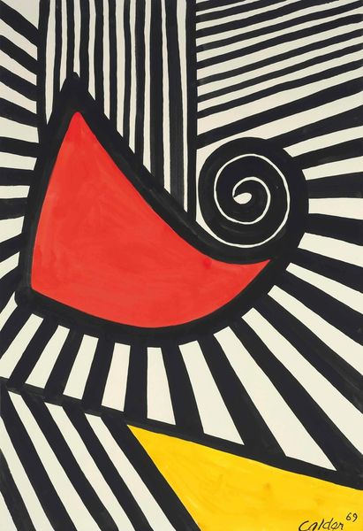 Alexander Calder made this gouache painting on paper, "Moulin à Vent," and signed it in '69, groovy! The colors are so direct, like a kid went to town with a set of primaries. You know, looking at it, I think about gesture, like Calder was jiving, improvising as he went. Those stripes radiating out, they’re not perfect, and that’s the charm. It’s like a windmill turning, or maybe his famous mobiles spinning and casting shadows. The texture isn't trying to hide itself. The paint is flat, and you can see the little imperfections where the brush dragged. It's a dance between control and accident, especially in that big black spiral. Does it remind you of a shell, a galaxy, or just pure energy? That's Calder, always playful, always inviting you to make your own connections. Thinking about this reminds me of Joan Miró, another artist who made simple colours and shapes into something profound. Art is just one big conversation, right?