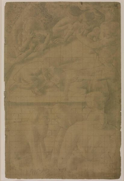 Curator: This is Sir Stanley Spencer's preparatory drawing, "Drawing for the Right Hand Section of 'Resurrection: Port Glasgow'". Editor: There's a quiet, almost reverent quality to this sketch, despite the monumental theme. The faint grid imposes a sense of order on the celestial chaos. Curator: The drawing offers a glimpse into Spencer's process; how he mapped out the composition for one section of his larger Resurrection project, which was never fully realized as he intended. The choice of Port Glasgow is noteworthy. Editor: Indeed. The resurrection motif, placed within the context of a Scottish shipyard, speaks to the transformative potential within even the most mundane, industrialized settings. Curator: Observe how the figures emerge from the earth, their forms rendered with delicate lines and subtle shading. It really emphasizes the materiality of their bodies. Editor: A commentary perhaps on the relationship between the spiritual and the industrial, mediated by ordinary working people? I'm left pondering the social implications of this redemptive vision. Curator: The grid itself becomes an intriguing layer, both constricting and liberating the figures within it. Editor: It’s as if Spencer is offering a meticulously planned intervention, a vision of transcendence embedded in working-class reality. A truly profound juxtaposition.