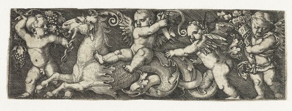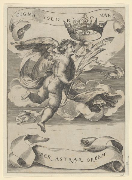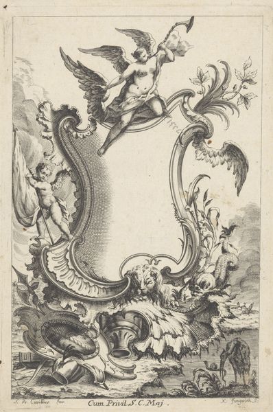 This is an engraving by Bernard Picart, made around the turn of the 18th century. The composition is immediately striking: two winged angels frame a central inscription, all interwoven with ornate foliage. The angels, rendered with delicate lines, carry a platter of circumcision instruments, their forms balanced by the symmetrical curves of the surrounding ornamentation. The engraving functions as a complex sign, embedding theological and cultural meanings within its visual structure. The symmetry of the composition reinforces a sense of ritual order, while the dynamic poses of the angels introduce a sense of movement and drama. The contrasting textures—smooth skin against feathered wings and intricate foliage—create a visual tension, inviting closer inspection. Consider how the artist uses line and form to elevate a potentially unsettling subject. The aesthetic beauty of the engraving transforms the circumcision instruments into objects of symbolic importance, prompting us to contemplate the intersection of faith, representation, and cultural identity. This work destabilizes the division between the sacred and the aesthetic, leaving us to reflect on how meaning is constructed through visual language.