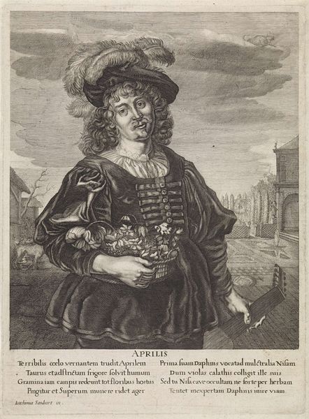 Curator: This engaging print is titled "April: Jongeman met bloemenmand," dating back to sometime between 1670 and 1726. It depicts a young man holding a basket of flowers. The execution is masterful in its rendering of texture. Editor: Yes, it’s an incredibly detailed engraving! My first thought is how the figure seems to embody a transitional moment. He looks almost uncertain, poised between established tradition and perhaps something new. The figure's clothing and general bearing suggest a staged representation of class and gender that challenges traditional markers. Curator: Indeed. Notice the careful balance between light and shadow, a technique particularly evident in the rendering of the subject’s costume. The lines defining the folds of the garments and the intricate patterns of his outfit demonstrate an understanding of visual storytelling. Editor: The flowers also provide an exciting visual texture. They become symbolic not just of Spring but potentially broader notions of growth, sexuality, and renewal. It could signal a time when social roles and identities were not as fixed as often presented within dominant historical narratives. Also, what do you make of the lute he carries? Is he perhaps an amateur musician from a prominent family? Curator: The lute could certainly imply a level of leisure and refinement. The work uses linear precision to convey a clear visual language. There's a very ordered structure within the composition; it leads the eye directly to the young man’s features. Editor: That sense of order interests me less than the little details: the odd perspective and the strange cloud formations—especially what looks like a miniature cow floating in the sky! Does it intend to poke fun at authority, using humor to make commentary about traditional social hierarchy? Curator: Whether the "cow" is intended satirically remains an interesting debate. What is unambiguous, though, is how line serves a primary role in this Baroque period engraving, helping us, even centuries later, understand what the anonymous artist wanted us to see, perhaps even celebrate. Editor: Well, for me, this piece prompts us to think about representation, identity, and social commentary as relevant yesterday as they are today. We see how artists in any age will leverage humor to subvert power, challenge authority, and redefine roles and meanings.
