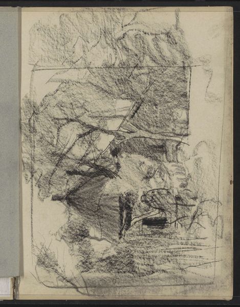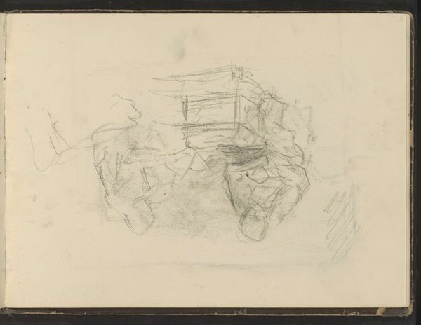Curator: Welcome. Here at the Rijksmuseum, we have before us a pencil drawing on paper by Maria Vos, dating from around 1856 to 1870, called "Plattelandshuis", or "Rural House". Editor: My first impression is of a quiet decay. The drawing possesses an almost mournful quality due to its lack of distinct lines and heavy reliance on tonal variation, despite that there isn't much contrast. The pencil strokes, so softly applied, give a blurred definition that somehow seems apt to convey something passing. Curator: Absolutely. Vos was working in a period where the Netherlands was deeply engaged with its national identity, often looking to rural life as the 'true' essence of Dutch culture. This image encapsulates that nostalgia, depicting what seems to be a weathered farmhouse, already bearing the signs of obsolescence. This may point to the effect of socio-economic transformations brought about by increasing industrialization, the slow depopulation of the countryside. Editor: What stands out to me structurally is the artist’s handling of light and shadow. Vos uses chiaroscuro not so much to define form rigidly, but more to evoke the passage of time, like capturing a fleeting moment as shadows lengthen over old brick and fading timber. There's an implicit story about the changing status of architectural monuments from human hubris to simple matter, or a simple fact of matter, really. The other sketchy figures outside the rectangle support this by remaining in the indefinite domain of background noise. Curator: True, we also need to consider where something like this may have been shown, what kind of patronage Vos might have sought with scenes like this. These weren't necessarily artworks intended for public display or radical artistic statements; there's the hint of a more intimate interaction with her audience, perhaps to awaken them to something more personal to the culture itself than mere architectural observation. Editor: Yes, this seems like an understated assertion of value. Curator: Agreed. Maria Vos is subtly urging us to think about not just landscape and architectural form, but the societal structures—or fractures—underlying this rapidly vanishing, uniquely Dutch, scenery. Editor: So even in its understated tones and somewhat indistinct definition, it communicates a profound connection with its context, an atmosphere to ponder rather than define. Curator: Exactly. We find ourselves questioning what is fading, and why that matters in that transitional point in time. Editor: A poignant observation, subtly drawn.