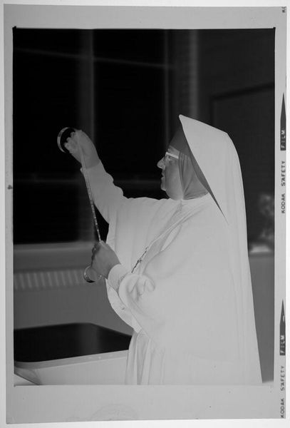 Editor: This is an untitled photograph by John Deusing, it depicts an older woman and a nun, and it's part of the Harvard Art Museums collection. It's very striking. What symbols or meanings do you see conveyed in this work? Curator: The visual language is fascinating. The nun, adorned with symbolic garb, stands rigid, embodying tradition. The other woman, seated, holds a book, a symbol of knowledge. How do these visual symbols speak to power dynamics? Editor: Interesting, I hadn't considered the power dynamics between tradition and knowledge. Curator: Yes, and think about the choice to portray both in white, perhaps signaling purity, but also a blank slate for societal expectations. Editor: I see what you mean, that's a whole new way to look at the image. Thanks!