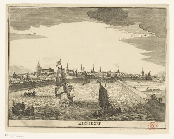 Curator: Before us is a Dutch Golden Age print, "View of the Hogesluis and the Amstel, with the Weesperzijde on the left and the Utrechtsepoort on the right". It dates roughly between 1685 and 1748, created by an anonymous artist. Editor: My first impression is how meticulously detailed it is. All those windmills lined up in the distance! There's a certain tranquility despite the clear articulation of labour and milling, the machinery of everyday life, embedded into the city's character. Curator: Exactly. Considering the period, this print offers a window into Amsterdam's booming trade and expanding city limits. It is about representing Dutch identity in its commercial and innovative achievements, yet also inevitably involves power dynamics related to gender, race and commerce during this time. Editor: I agree, the image points to economic and societal changes, reflected in the craftsmanship too, an early mass-produced form of disseminating information, using metal plates to create this detailed visual document. It reflects on who controlled such tools, labor of the engraver, production of ink, all connected to social mobility. Curator: Right, consider the placement of the Utrechtsepoort, marking a liminal space, where privilege resided inside the gates. The image's portrayal of leisurely dressed gentry enjoying time reinforces such constructs. How labor of various forms and status upheld that class’ lifestyle is important. Editor: I'm drawn to the different types of labour here – those operating the barges, processing flour or even maintaining that long Hogesluis bridge. It shows us that Amsterdam was a carefully constructed and maintained landscape as much as it was a natural one, that bridges facilitated movement but are forms of work. Curator: By recognizing such forms of embodied labour alongside artistic labor that renders that visibility possible, we recognize the broader contributions involved in crafting urban, collective identities through trade routes. Editor: The engraving makes visible what otherwise may have remained unseen regarding production and movement of materials, as well as peoples throughout the expanding landscape that comprised old Amsterdam. Curator: I think seeing how a city understood its identity through trade and its place within complex sociopolitical shifts reveals much. Editor: A single print allows for a surprisingly layered examination into Amsterdam's character, which emphasizes how materials intersect in their production within society.