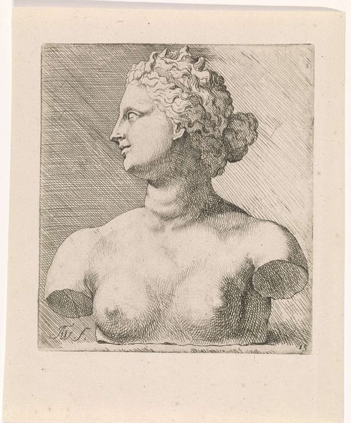 Wenceslaus Hollar created this print of an antique bust of a woman in 1649. The composition is dominated by the bust, rendered with fine, deliberate lines that create subtle gradations of light and shadow, evoking a palpable sense of form and texture. The woman's gaze is directed away, lending a sense of detachment and contemplation. Hollar masterfully uses the etching technique to explore the interplay between line and space. Notice the contrast between the meticulously detailed rendering of the bust and the stark, empty background. The hatching and cross-hatching create a visual rhythm, lending depth and dimension to the subject. Here, we can observe how the artist skillfully translates three-dimensional form into a two-dimensional medium, inviting us to consider the relationship between representation and reality. This is an exercise in understanding the symbolic language of art and its power to evoke meaning through form.