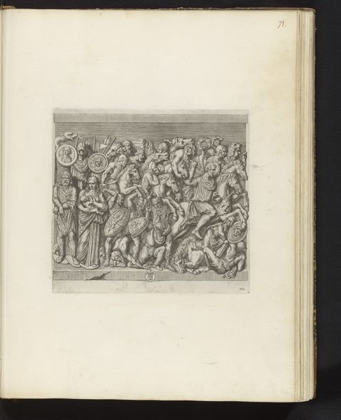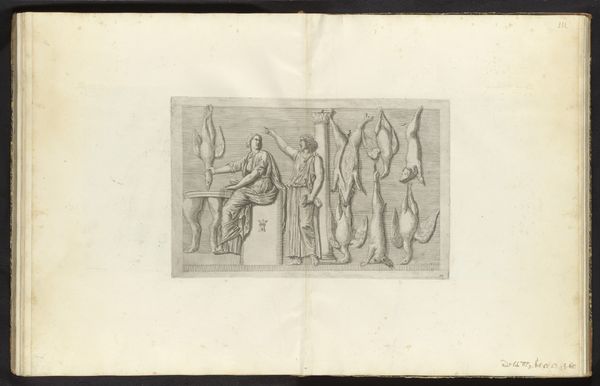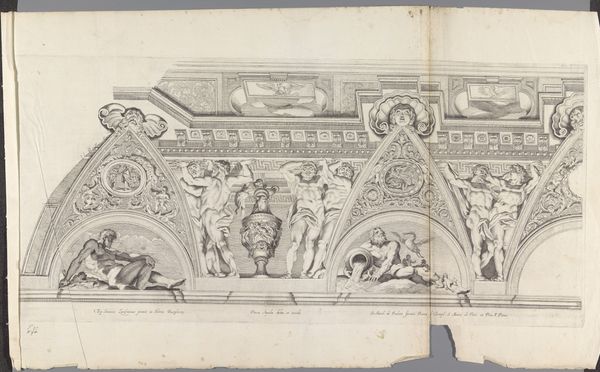 Curator: Welcome. We're looking at a print titled "Bas-reliëf met putti," or "Bas-relief with putti" made between 1636 and 1647 by Pieter de Bailliu. It resides here in the Rijksmuseum collection. Editor: Immediately, I'm struck by its rather playful, almost frivolous character. It has the texture of aged parchment, with an exquisitely light touch to each line. The artist coaxes depth and form with the most subtle shifts in tone, wouldn’t you agree? Curator: Certainly. Look closely at the composition; observe the arrangement of the putti and their placement within the architectural setting. The linear quality creates depth and highlights the sculptural nature of the design itself, playing with relief. It echoes classical form, mediated through the Baroque interest in ornamentation and detail. Editor: It reminds me of academic exercises. What does the imagery communicate? Are these merely chubby children, or do they evoke a deeper symbolism, such as love, innocence, or the cycle of life as traditionally interpreted? This feels complicit, in some ways, with a worldview privileging leisure and the aestheticization of existence, when considering its time. Curator: I’d say that is too simplistic. Notice how Bailliu manipulates light and shadow to emphasize certain forms, drawing the eye to moments of tension or resolution within the composition. The very execution in print form transforms something classically conceived of as high art into something replicable and widely available for study. The linear design emphasizes clarity and precision. Editor: But who had access to it? I appreciate your pointing to formal concerns, of course. However, understanding the work also requires situating it within social hierarchies. Did it only function to naturalize systems of power? To instruct? It begs further inquiry into its complex cultural encoding as it circulates. Curator: Perhaps. The interplay between form and function generates multiple interpretations, from a purely aesthetic appreciation of line and form to deeper reflections on its content. In the end, this work's elegance invites scrutiny from various standpoints. Editor: Absolutely. Analyzing its legacy by bridging history and critical theory is key to understanding how art of the past still has impact today. Thank you.