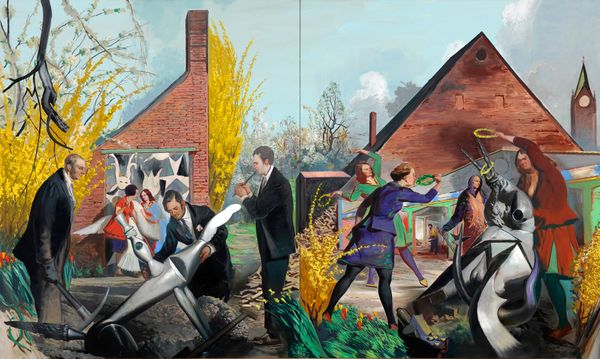 Kent Monkman’s painting, "Death of the Female", unravels conventional historical narratives through a powerful intersection of sexuality, colonialism, and Indigenous identity. Monkman, a Canadian artist of Cree ancestry, inserts his gender-fluid, two-spirit alter ego, Miss Chief Eagle Testickle, into historical and contemporary settings, challenging the erasure of Indigenous experiences. In this scene, Miss Chief takes aim, suggesting a disruption of the colonial tableau before us. The imagery of a community grappling with violence is juxtaposed with symbols of cultural imposition—the church, the house—prompting questions about the ongoing effects of colonialism on Indigenous communities. Figures in traditional dress watch, while the contemporary chaos unfolds, asking us to bear witness to the complexities of the present. Monkman uses his art to rewrite history by including Indigenous perspectives. The raw emotion in this painting reminds us of the deeply personal and political work of reclaiming identities and histories.