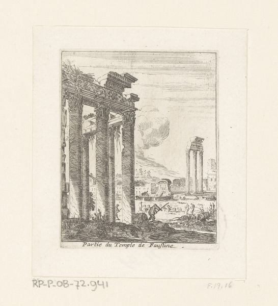 Curator: Let’s take a look at this print, “Gezicht op een ruïne met figuren op een trap en bij een balustrade,” which translates to “View of a ruin with figures on a staircase and at a balustrade.” It’s an etching by Juste Nathan Boucher, made sometime between 1772 and 1779, currently residing here at the Rijksmuseum. Editor: The ruin dominates the image with its crumbling yet majestic architecture rendered in warm sepia tones. The figures in the foreground feel quite small compared to the ruin; they almost disappear against the monumentality of the site. Curator: Boucher was working in a time captivated by Neoclassicism. This piece participates in that trend, fueled by discoveries at Pompeii and Herculaneum, as it allowed Europeans to ponder their connection to the Ancient world and the grand narratives associated with it. The view serves as a stark reflection of power, time, and mortality. Editor: And considering the cultural moment when this was created, what statement could Boucher be trying to make about structures of power? Here we have architecture—intended as a symbol of strength and permanence—crumbling before our very eyes. Then we must account for who this work may have served during its original viewing. Curator: It’s intriguing to think about how Boucher is portraying these ruins. He wasn’t just interested in the structure; he paid careful attention to the social history they evoke. The very idea of the ruin was politically charged, embodying shifts in power, lost empires, and maybe even serving as an ominous prophecy. It raises so many questions about who gets to write history and what legacy truly means. Editor: Absolutely. There’s a definite air of romanticism to the work as well, inviting viewers to consider what existed prior and those lost experiences of the now deteriorated location. Beyond the aesthetic, though, it challenges the presumed stability of social order, asking if even the most imposing structures are ultimately ephemeral. Curator: By combining artistic license with archaeological reference, he gave his viewers not just a depiction of a location, but a visual argument. This etching continues to prompt us to examine not just art’s history but the history held within it. Editor: It all comes together as a silent, potent challenge. Thanks for unraveling those historical layers.