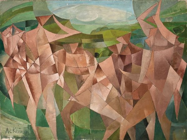 Maggie Laubser painted "Cows and Rainbow" with oil on canvas, using bold, expressive brushwork to capture a pastoral scene under a vibrant rainbow. The painting's composition is organized into strong horizontal bands of colour, creating a sense of depth and space. Laubser's unique approach destabilizes conventional notions of landscape painting. The cows, rendered with simplified forms and earthy tones, are placed in a field that rolls in layered hues of green, pink, and yellow. Overhead, the rainbow's arch acts as a framing device, emphasizing the artificiality of the scene and drawing attention to the painting's surface. This flattening of perspective aligns with modernist tendencies to question traditional representation. The semiotic structure of the artwork invites interpretation. The rainbow, a symbol of hope and promise, contrasts with the everyday presence of the cows. This juxtaposition suggests a dialogue between the ideal and the real, reflecting Laubser's engagement with poststructuralist ideas about the instability of meaning. The flattened space, and the simplified forms draw attention to the canvas, and the materiality of paint as a surface.