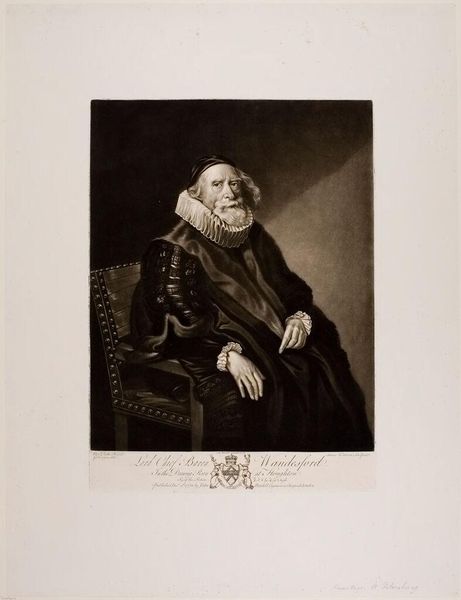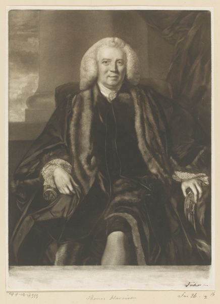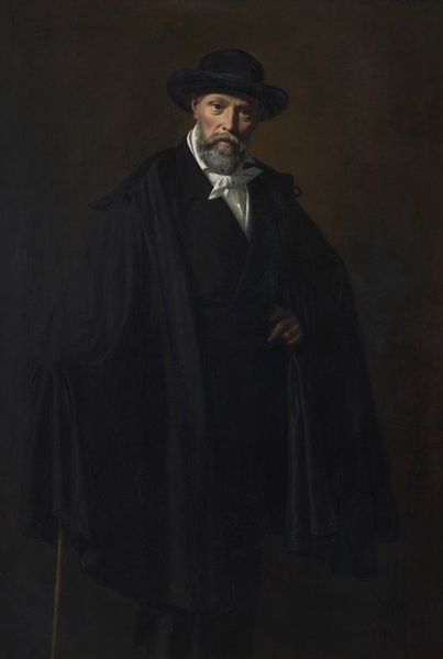 Curator: Here we have Jacob Dutweiler Wagner’s portrait of Henry Willard Williams, currently held in the Harvard Art Museums. Editor: Oh, he looks like a man of serious thoughts. A kind of quiet thunder emanates from that canvas, wouldn’t you agree? Curator: Absolutely. Look closely at the textures—the velvet of the robe, the crispness of his white bow tie. Wagner masterfully uses oil paint to convey the status and materiality of his sitter. Think about the garment-making, the social significance of academic dress. Editor: Yes, and that hand holding a scroll… It speaks of a life dedicated to learning. The red sash hints at passion, but it is tempered by the somber black robes. It’s a carefully balanced composition, really. Curator: Indeed. It’s a study in contrasts. The dark backdrop emphasizes Williams's luminous face and beard, drawing our attention to his gaze. Editor: It makes you wonder about the stories that man could tell, doesn't it? The weight of experience and knowledge somehow captured in paint. Curator: Well, considering the context of the time, it's a fascinating glimpse into the academic elite. Editor: Fascinating, and strangely moving, when you let yourself get lost in it.