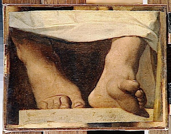 This panel of The Crucifixion by Matthias Grünewald, presents the body of Christ, flayed and punctured, set against a dark ground. The stark materiality of Grünewald's painting lends a disturbing immediacy, heightened by his choice of oil on wood panel. The composition centers on the body's disfigured surface. Grünewald employs a semiotic system of marks - the wounds, gashes, and livid flesh - to signify profound suffering. The loincloth, although rendered with meticulous detail, barely conceals the ravaged flesh, emphasizing the themes of agony and sacrifice. Consider how Grünewald destabilizes the traditional image of Christ by depicting his broken body with an almost brutal realism. He challenges us to reconsider the meaning of redemption. This is not a transcendent vision, but an unflinching engagement with physical suffering. Ultimately, the painting presents the body not just as a religious icon, but as a site of profound human experience.