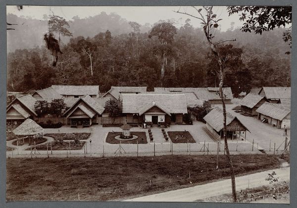 Curator: Here we have a photograph entitled "Bivak te Krueng Seumpo," taken sometime between 1903 and 1913. It is a striking landscape study that feels steeped in another time. What's your first impression? Editor: A remote order, and frankly, the inherent tension in the landscape pulls at me. It is placid at first glance but look closer at the people standing near the right-hand dwellings – I see not just stillness, but a holding of breath. Curator: Indeed. The ordered dwellings stand in stark contrast with the seemingly infinite wilderness rising up behind it, pressing down on this constructed order. It suggests ideas about the human relationship to the seemingly infinite power of Nature, which is certainly an element common across the various mythologies of this region. Editor: Precisely, there’s this weight. Given its creation date, doesn’t this composition also serve as a documentation of power relations in early 20th century colonial contexts? Look how rigidly organized this outpost seems – almost like a stage set to display "civilized" order imposed upon a wilder world. The rigid grid and low bushes act like framing devices for human control. Curator: That’s a crucial point. Symbolically, this layout also suggests an internal world, meticulously organized, warding off exterior chaos. A bivouac is, after all, temporary, symbolic of human's place in a time when things are transitional and fragile, both culturally and physically. Even in their rigid orientation to some unpictured Western ideal, they can’t fully subdue the native setting around it. Editor: So what tensions does that set up, thinking in terms of historical memory? As photography developed as a means of representation and record-keeping, it became intertwined with narratives of progress and modernity, narratives that reinforced European imperial projects. Does "Bivak te Krueng Seumpo" reveal not just cultural anxieties in response to this, but, perhaps also some self-justification of colonisation by framing them as safe points for civilization? Curator: Absolutely. Its aesthetic qualities subtly advocate for control. One might read those low bushes, as more than a geometric affectation – perhaps instead of hedges as the beginnings of symbolic barricade against the indigenous life that they border. This landscape holds layers of narratives regarding control, expectation, and the psychology of constructed social spaces. Editor: Yes, even in its monochrome stillness, a picture intended to instill ease speaks volumes. I feel dis-ease. Curator: An astute feeling, as this “bivouac” isn't just a picture; it is also a marker for complex relations and symbolic control.