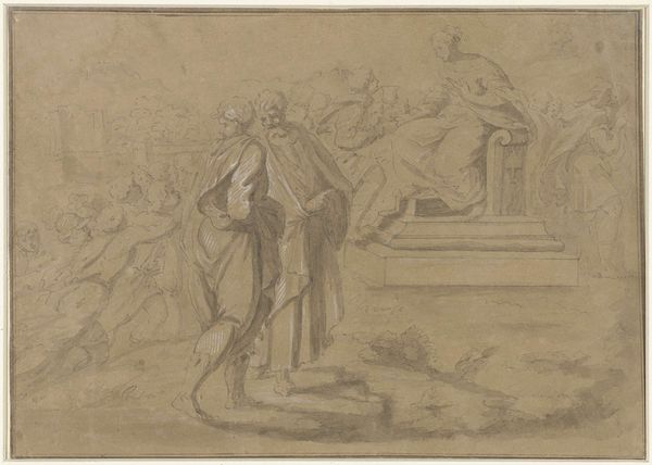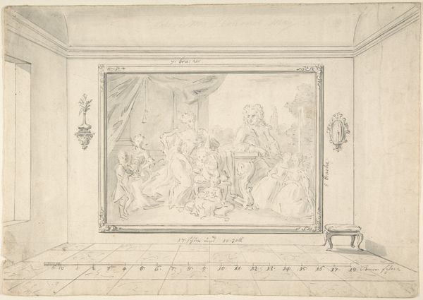 Editor: Here we have Augustin Pajou’s drawing, "Pyrrhus in the House of Glaucias," created sometime between 1747 and 1761. It's currently housed at the Met. It's such a delicate pencil drawing –almost like a ghost of a grand painting, wouldn't you say? What really strikes me is the composition, all these figures frozen in what looks like a very dramatic moment. What do you see in this piece? Curator: You've touched on something important there. It *is* like a ghostly premonition of a grander statement. This drawing, like so many Neoclassical works, draws inspiration from antiquity— both its style and its narratives. The scene itself comes from Plutarch, chronicling the story of Pyrrhus, who's brought as a child to King Glaucias for protection. But what interests me isn't just the story. It's the feeling, that hushed anticipation, almost as if the figures are posing for an ancient stage. Can you sense it? Editor: I do, actually, especially in the way they're all positioned looking at one specific point on the platform. It almost feels a bit theatrical. Curator: Precisely! And this is where it gets fun. The Enlightenment was all about reason, yes, but also about grand emotions, carefully orchestrated. Pajou uses the clarity of line, very characteristic of Neoclassicism, to convey that reason, while he stages the figures with great emotion like a scene from a tragic play. Think about the slightly exaggerated gestures, and everyone seems to be either pleading or presenting. Do you get a sense of where Pajou's sympathies lie? Is he making a statement or just depicting a well-known story? Editor: I’m not sure. It feels like there might be something he's hinting at, especially the slightly forlorn look of the young Pyrrhus. I almost want to know what happens next. Curator: And isn’t that the delicious part of history and art? It invites us to play detective, piecing together stories and emotions from a time long gone. It's more about asking the questions than finding definitive answers. Editor: It gives me a fresh way to look at not just the historical context, but the story behind the art. Thanks.