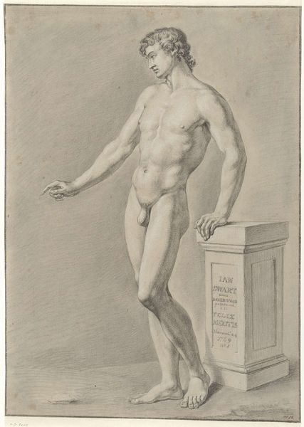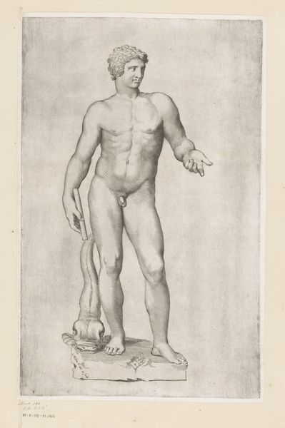 Pieter van Gunst created this male nude study using etching and engraving, techniques that demand meticulous labor and skill. The image emerges from a dense network of precisely incised lines. Look closely, and you can see how the varying density and direction of these lines create subtle tonal gradations, bringing volume and texture to the figure's skin and musculature. The contrast between the smooth planes of the body and the intricate details of the hair and drapery showcase van Gunst's mastery of these demanding methods. Engraving and etching were central to the printmaking industry of the 17th and 18th centuries. Though valued for their aesthetic qualities, prints were also commodities, produced and circulated in large numbers to meet the growing demand for visual imagery. Van Gunst's technical virtuosity thus served both artistic and commercial ends, demonstrating the complex relationship between skill, labor, and the burgeoning market economy of his time. Appreciating the artistry of this image involves understanding the social and economic conditions of its making, and its place within a broader culture of reproduction.