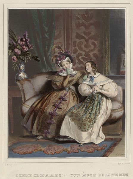 Louis Marin Bonnet created "The Lover Heard" as a color etching and engraving in 18th century France, offering us a glimpse into the social rituals of the era. Here, we witness a scene of courtship, heavy with the symbolism of class and propriety. The architecture and fashionable dress signifies the opulence of aristocratic life, where even intimate moments occur within a framework of social expectations. This piece reflects the values of its time, where the game of love was governed by strict rules. Bonnet's technique further emphasizes this sense of refinement, mimicking the delicate touch of pastel drawings popular among the elite. To fully appreciate this artwork, we can consult period etiquette manuals and fashion plates. Art, after all, is not created in a vacuum, but rather in the midst of a web of social institutions.