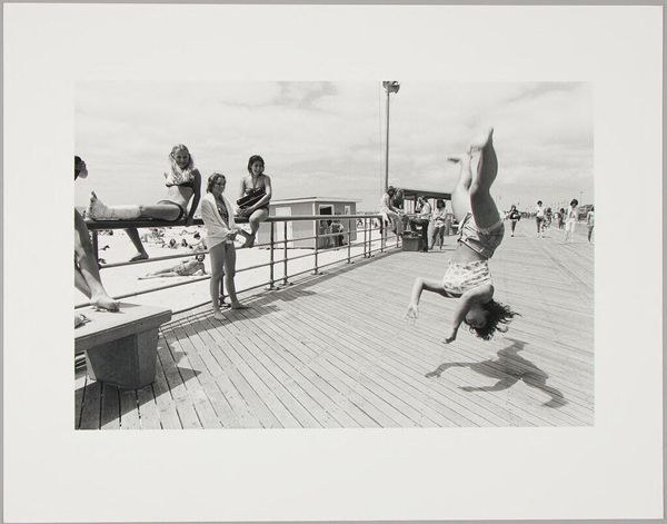 Curator: Bill Dane, born in 1938, made this gelatin silver print. It is held at the Harvard Art Museums, its title, “Untitled (Bobby, I want to apply for a guggenheim)." Editor: It's visually striking. The high contrast and the positioning of the figures create a sense of intimacy, almost voyeuristic. Curator: The subjects, seemingly performers, appear in states of preparation. The woman adjusting the other's feather headdress, it speaks to performativity and identity. Editor: Precisely. This work is very telling of the politics of identity, performance, and labor. It presents the idea of constructing the self within the gaze of the other. Curator: And Dane's use of snapshot aesthetic, the casualness of the composition, challenges traditional notions of photographic beauty and artistic intention. Editor: Agreed. The title itself suggests a critique of institutional validation, hinting at the artist's own ambitions and perhaps frustrations. Curator: Yes, and there's that interplay between private moment and public spectacle, a tension Dane captures masterfully. Editor: Exactly. Considering the social context, there's a discussion to be had about how queer identities are constructed and perceived. It really makes one think. Curator: It is a photograph of potent simplicity, a wonderful commentary. Editor: The photo’s layered meanings are what make it so very compelling.