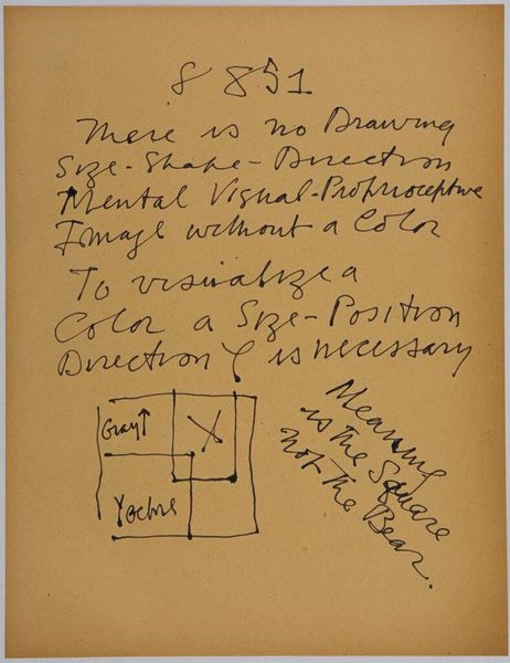 Editor: Stuart Davis's "Art Theory Text with Sketch" is a drawing with text, though it doesn't have a listed date. I find the sketch itself playful, almost like a puzzle box, while the handwriting is quite assertive. What do you see in this piece? Curator: The symbols Davis employs seem to act as a personal lexicon. What memories, what experiences are embedded within those lines and shapes? The text itself alludes to a 'code-logic.' Editor: So, the drawing isn't just an abstract sketch, but a personal language? Curator: Precisely. And like any language, it reflects the artist's unique perception and worldview. Editor: That's a fascinating perspective; it makes me want to understand his symbols. Curator: Indeed, art becomes a form of communication, and we, as viewers, are invited to decipher the visual code.