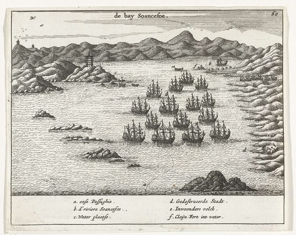Curator: Here we have "Vloot bij Goutsoe (China), 1663", dating to 1670. It's an engraving, offering a meticulously rendered depiction of a Dutch fleet positioned off the Chinese coast. Editor: It feels… calculated. Ordered. Not quite celebratory, but definitely imposing. There's a clear sense of power conveyed through the sheer number of ships and their precise arrangement in the harbor. Curator: Indeed. Consider the etcher’s labor. Each line painstakingly carved into the plate, then inked and pressed, to produce an image intended to circulate widely. What this says about the production of printed material and accessibility in spreading information is important here. It’s far from a quick sketch. Editor: Precisely. These images played a significant role in shaping public perception of Dutch mercantile power and global reach. Think about the intended audience – presumably back in the Netherlands – receiving these dispatches from faraway lands, solidifying narratives of exploration and trade dominance. Curator: And not just trade, but power projection, visibly reinforced through the weaponry on those ships. We need to examine how the image functions in Dutch social context and within the growth of early capitalist modes of production and exchange. What’s at stake materially to render China knowable, and appropriable in that early-modern Dutch imaginary. Editor: Good point, and how this kind of controlled image-making fed into the institutional power structures that upheld these global ventures. Think about how galleries displaying similar works were visited, thus helping to legitimize a certain worldview, one that positioned Europe at the center and legitimized these foreign adventures. It also illustrates the era's nascent awareness of global positioning. Goutsoe—modern Guangzhou—is identified so this image isn’t just of some foreign land, but is presented with geographic specificity. Curator: It definitely presents a sanitized view of complex interactions and possible exploitation that often underpinned this type of mercantile operation. These are all pieces contributing to a highly manufactured spectacle of control and abundance for European consumption, carefully excluding any sign of hardship or resistance. Editor: True, a potent reminder of the power of visual culture in shaping both historical narratives and present-day understanding. It provides a lens through which we can appreciate how empires were constructed and understood through popular art and image making, creating historical narratives.