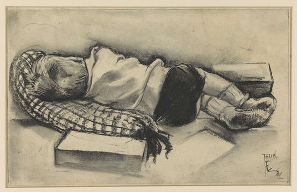 Curator: Right now we are looking at "Rekonvalescent", a drawing from 1927 by Ludvig Find. The piece is made using charcoal, and resides here at the Statens Museum for Kunst. Editor: A figure shrouded in bedding, reading, bathed in a grayscale softness… it feels quiet, heavy, a little claustrophobic. There's something undeniably melancholic about it, but I find the image ultimately comforting. It seems a beautiful observation about life’s softer, slower moments. Curator: Note how the intimacy suggested is not only a result of subject and setting, but stems directly from the artist's material and its deployment. The immediacy of charcoal on paper speaks volumes about the artist's process. What we are witnessing here is less a finalized portrait, and more an act of capturing, framing. Editor: Precisely! I agree wholeheartedly. This drawing feels more akin to a memory being recalled, an intimate sketch of the familiar. It brings to mind mornings when sunlight couldn’t quite break through. The heavy reliance on charcoal – a modest material – enhances that feeling for me. Do you feel as if that choice amplifies a feeling of quiet domesticity? Curator: Certainly. Furthermore, considering Find’s artistic training, rooted in traditional drawing and painting techniques, charcoal enabled a break from more rigid artistic expectations. Using cheaper, readily available supplies gave Find a freedom and flexibility of expression, while at the same time also nodding to the economic struggles of that period in Europe. It asks: who are works of art ultimately for? Editor: What a striking thought! Now I’m imagining the subtle narrative Find may be hoping we infer beyond the visible: The texture, the tones…it’s a gentle hum. Do you suppose that intimate perspective invites viewers to connect with something of their own lives through this visual experience? Curator: No doubt, it speaks to universal experience even as its composition reminds us of the means by which such experience is created. This work functions as a space where material and intimate reflection converge. Editor: An intersection that can linger long after we move on… It’s funny how something as quiet as charcoal can convey so much. Curator: Exactly. Thank you for sharing such a resonant insight.