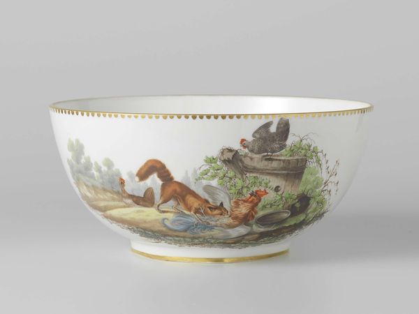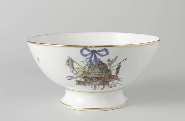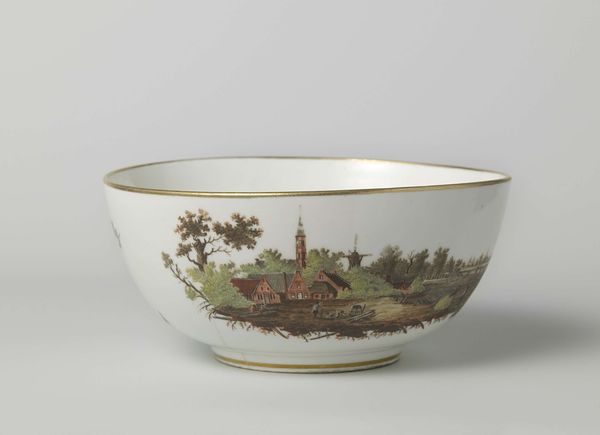 Curator: This is a captivating porcelain bowl, or 'Spoelkom met riviergezicht' as it's known in Dutch, crafted between 1809 and 1814 by the Koninklijke Porseleinfabriek Dommer & Co. currently held in the collection of the Rijksmuseum. Editor: The first thing that strikes me is how intimate the whole scene appears, neatly framed. There is a calmness to the depicted landscape. Curator: Indeed. It's fascinating how the form of the bowl dictates the composition. The curvature accentuates the serene river view. It has an internal logic that relies not only on representation, but form. The painted details adhere strictly to this frame, both literally in terms of the gilded edges, and allegorically, to its constraints. Editor: The presence of a church with a tall spire hints at a more structured existence outside this arcadian bubble. Is the water intended to invoke reflection or suggest freedom? Are we, as viewers, meant to project onto this rural scene? Curator: Well, Iconographically speaking, water represents both life and death, purification, the subconscious, etc. What seems most evident to me in its execution, is that the composition operates as a series of calculated pictorial planes – consider the treatment of depth and the considered application of pigment in defining shapes. There is also the very distinct interplay of negative and positive spaces that guide the viewer's eye along its delicate edge. Editor: Agreed, though perhaps the artist used that compositional tension to heighten the feeling of serenity in opposition to underlying emotional unrest. I’m especially drawn to how figures pause at its rivers edge. It's an incredibly detailed, idyllic vision. Curator: Ultimately, whether one interprets the bowl’s artistry through a symbolist lens or formal structuring, its impact remains palpable. The relationship of the artist to the material, and subsequently, our relationship to that history, creates this sense of feeling. Editor: This is what renders it so poignant. A perfectly contained reflection on life and place from centuries ago.