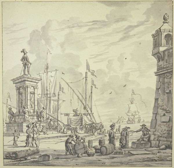 Abraham Storck the Elder made this pen and gray ink drawing, "Seehafen, vorne eine Gondel," capturing a bustling harbor scene. Storck, situated in the vibrant and prosperous Dutch Golden Age, was part of a society deeply engaged in maritime trade and exploration. This drawing presents a society keenly aware of its global reach and economic power. Look at the gondola in the foreground, filled with what appear to be affluent passengers; it offers a glimpse into the lives of those who benefited directly from the era's maritime activities. The grandeur of the architecture, combined with the active harbor, speaks volumes about the era's values of commerce and status. However, this image also prompts us to consider the labor and the lives of those who remained invisible in such representations. "Seehafen, vorne eine Gondel" invites a deeper reflection on the complexities of power, privilege, and the human cost of the Dutch Golden Age. It gently reminds us to question what is shown, and perhaps more importantly, what is intentionally left out of the picture.