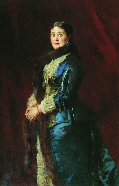 Editor: We're looking at Konstantin Makovsky's "Portrait of Tradeswoman E.Rastorgueva" from 1885, rendered in oil paint. I find her gaze both inviting and subtly challenging. What strikes you about this painting? Curator: Oh, she's absolutely commanding, isn't she? Beyond the velvet and lace – which whisper of a certain societal stratum, almost an old-world grandeur, it’s her presence, really, isn't it? Those shrewd, kind eyes, framed by that delicate headpiece… they hint at stories. Imagine the bustling marketplaces, the keen negotiations. And the red background! Like a silent scream behind quiet composure, you know? Don’t you just want to pluck her from the canvas and share a cup of strong tea, hear her tales of bartering and balancing life's ledger? Editor: It's interesting that you call it a scream, when to me the deep red suggests an intimacy, as if she is receiving you into a domestic sphere, like she is in charge there. Is she idealized at all? Curator: Well, Romanticism often dips its brush into idealization, doesn’t it? But I wouldn't call this blatant flattery. See the slight imperfections, the hints of gravity in her face? I feel Makovsky respected her, saw her strength not in abstract symbolism but in the everyday, in the capable hands adorned with delicate gold. Maybe it's a quiet ode to a merchant-class woman, and these pearls, fabrics, gold decorations signal dignity and well-earned status within an evolving Russian society. Editor: That changes my perception completely. It goes beyond just a portrait to capturing a moment in time and a shifting societal dynamic. Curator: Precisely! Art is often more layered than lace, isn't it? I came in with a notion, as did you. Isn't it wonderful how our eyes and imaginations can uncover so much meaning together? Editor: It really is, thank you for the new perspective!