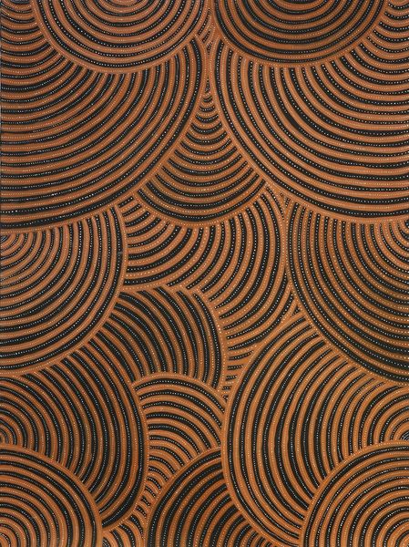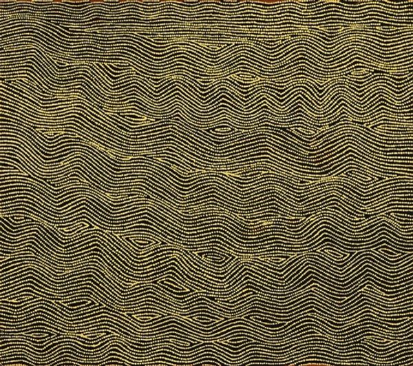 Editor: This is Warlimpirrnga Tjapaltjarri’s "Tingari Cycle at Wilkinkarra (Lake Mackay)" from 1999, made with acrylic paint. The repetition of lines and dots creates a really captivating, almost hypnotic effect for me. What do you see in this piece? Curator: The rhythmic patterns indeed draw the eye, but it’s important to consider that for the artist, this is much more than abstract decoration. It visualizes the Tingari Cycle, a series of creation stories central to the Pintupi people. Consider how those sinuous lines might symbolize the journeys of ancestral beings across the land. Editor: So, the patterns are maps of stories? That makes the repetition seem almost like chanting, a way to remember and pass down knowledge. Curator: Precisely. Think about the psychological impact of this imagery. For generations, such designs, rendered in sand or on bodies, have served as powerful mnemonics, linking individuals to their cultural heritage and the landscape itself. What do the ochre tones suggest to you? Editor: Earthiness, connection to the land... but also maybe a feeling of timelessness, given ochre’s use throughout art history. The rhythmic patterns, I think, enhance that. Curator: Yes, exactly! Now consider this work within a history of abstraction. While seemingly abstract to some viewers, within its cultural context, the painting is rich with specific narratives. The concentric circles, lines, and dots possess profound significance. The image acts as a cultural anchor, reinforcing collective identity and beliefs. What do you think of how the artist’s work allows others to understand the memory behind its imagery? Editor: I find the capacity of the art piece really touching, using abstraction and rhythm to tie its viewers into a shared cultural understanding. It definitely enhances the artwork, to say the least. Curator: Agreed. It reminds us of the powerful ways visual symbols carry cultural memory and continuity across generations.