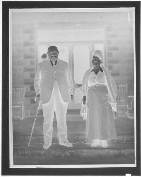 Editor: This is "Abu Zahr and his wife," a black and white photograph taken by Hashem el Madani in Lebanon, sometime around 1973-74. There's something so endearing, yet also stiff and formal about it. What does this photograph tell us about that time and place? Curator: It’s a fascinating glimpse into the social rituals of mid-century Lebanon. These studio portraits, common across the Middle East, acted as powerful declarations of identity and status. The backdrop and posed nature speak volumes about constructed images of marriage. How does the presentation challenge or affirm stereotypes, do you think? Editor: I guess it challenges stereotypes by showing a specific, personal image instead of a generalization. It’s so intimate in a way, even though it's posed. Curator: Exactly. The photograph becomes a document of personal history intertwined with broader social practices. It makes you wonder about the power dynamics at play in constructing such images for public consumption. Editor: It's interesting how a simple portrait can reveal so much about culture and society. Curator: Indeed, it makes you consider the political role of imagery in everyday life.
