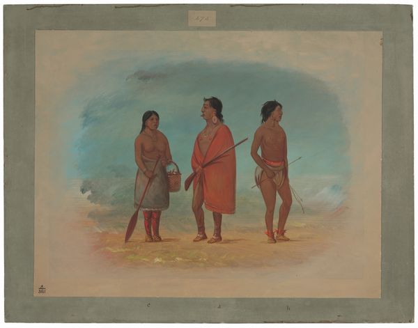 Editor: This is George Catlin's "Flathead Indians," a watercolor from 1861. It's interesting to see how he captures this scene of everyday life with a soft, almost romantic light. How do you interpret this work in light of the history between white settlers and Indigenous peoples? Curator: Catlin positions himself as a documentarian, yet we must consider the power dynamics inherent in his gaze. His work romanticizes Indigenous life, which in turn simplifies it to easily justify dispossession. How might viewing this as an act of cultural appropriation and misrepresentation change our understanding? Editor: So you're saying that his romantic portrayal, although seemingly positive, served a political function? Curator: Precisely. This idealization occurs during a period of intense conflict and displacement. It obscures the violent realities of settler colonialism. Does the fact that Catlin profits from the representation of his subjects, selling images of Indigenous peoples to white audiences, reinforce existing power structures? Editor: Absolutely, it raises a critical question about who controls the narrative. What is the role of institutions and how do they perpetuate or challenge misrepresentations of marginalised communities? Curator: Exactly! Who benefits from this image? How does it contribute to a collective memory that continues to marginalize Indigenous voices and experiences? It forces us to confront not just Catlin's intentions, but also the consequences of his actions and artistic choices in perpetuating a harmful legacy. Editor: It's much more than just a pretty scene, isn’t it? This has given me a new understanding of visual art. Curator: I hope that considering the intersections of art, power, and representation empowers us to create a more accurate understanding of our world.