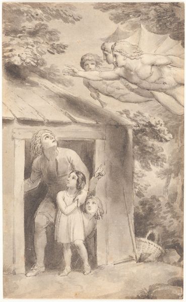 Editor: Here we have Giuseppe Maria Crespi's "Plate 9: Marcolfa finds Bertoldino hatching eggs, from "Bertoldo, Bertoldino, and Cacasenno", created between 1705 and 1715. It's an engraving, and there’s a striking contrast between the innocent scene of the child with the birds and the looming figure of Marcolfa. What societal dynamics are at play here, do you think? Curator: It's tempting to see this as a simple genre scene, but consider the broader context of early 18th-century Italy. Crespi, though working within the Baroque tradition, was also pushing boundaries by depicting everyday life. This image engages with power structures: the adult, Marcolfa, spies on the child, disrupting a private moment. Editor: So you see the act of observing as significant? Curator: Absolutely. Marcolfa’s gaze represents social control. We see an adult's control over childhood, but even deeper the control of those with privilege on those with little social power. What might the act of “hatching eggs” symbolize in this dynamic? Consider how the expectations placed on children can be both nurturing and constricting. Editor: It could symbolize imagination or freedom, things that Marcolfa, as an authority figure, is implicitly suppressing with her presence. Curator: Precisely. This print, while seemingly lighthearted, prompts us to think about societal expectations, the gaze, and the limited freedom afforded to individuals based on their social standing. Crespi cleverly uses an everyday scene to question accepted norms. What can we infer from the almost caricaturistic quality of Marcolfa's figure? Editor: Maybe Crespi is suggesting we shouldn't take her authority too seriously. It makes me think about the ways institutions exert power, even when they appear ridiculous. Thanks! I definitely have a fresh perspective now. Curator: Indeed, it is these questions, situated between then and now, that keeps historical context alive. The value lies in our continuous effort to reflect.