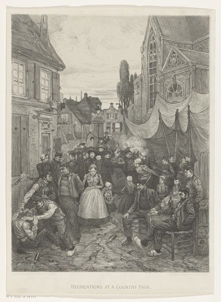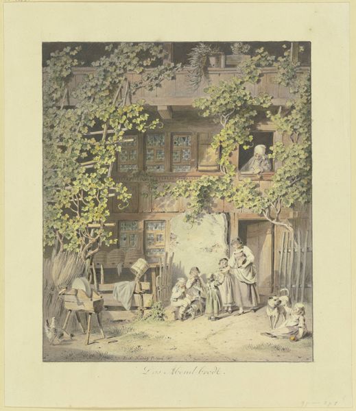 Curator: We're looking at "Boerenpoort in de Joodse buurt in Den Haag," created by Willem Bernardus IJzerdraat sometime after 1860. It's currently housed here at the Rijksmuseum. Painted with watercolor in what seems to be plein-air style. Editor: It’s such a busy little scene. The light, muted colors give it a calm veneer, but look at the number of figures clustered under that archway! It makes me feel like an uninvited voyeur into a bustling community hub. Curator: The image captures a vibrant segment of The Hague, focusing on daily life in what was then its Jewish quarter. Note the distinctive dress of some of the figures, their clothing indicating their Jewish identity within a specific cultural and geographic context. Editor: The architectural space of the gateway, and the close gathering of the people feels both welcoming and constricted. Did this image play a role in either idealizing or perhaps stereotyping this community during its time? Curator: Given IJzerdraat’s background, primarily as a landscape painter, I see him attempting to document and celebrate a specific locale and moment. These genre paintings often reflected the broader socio-economic currents within Dutch society. Editor: I am intrigued by the choice to depict the community specifically under this arched gateway. Is the artist implying a sense of enclosure, a boundary, or perhaps the protection it afforded in a world that wasn’t always kind? Curator: It's probable that it reflects both. Certainly, the location offers protection. The use of watercolor adds to the transient feeling and suggests fleeting everyday moments in this location, allowing viewers to engage with history and the rich complexities of daily life from that time. Editor: It's a small peek into their lives that offers a reflection on what we now consider identity, migration, and societal inclusion in relation to marginalized communities. Curator: Exactly. We see an historical record, yet it also raises ongoing concerns in modern society regarding tolerance, diversity, and representation. Editor: Thank you, that added depth. It made me rethink its relationship with ongoing dialogs regarding identity and community in a rapidly changing world.