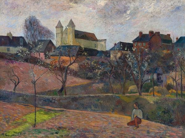 Curator: So, here we have Maxime Maufra's "The Village of Rosporden (Finistère)," a landscape rich in Impressionist texture. Editor: It feels like a quiet moment, doesn't it? Somber, almost, with that heavy sky. I imagine the air is damp. Curator: Maufra uses broken brushstrokes, dabs of color rather than smooth blending, which gives it that hazy atmosphere you're sensing. Note how the steeple pierces through the greenery, anchoring the composition. Editor: The steeple is such a strong vertical element amid all the horizontal strokes. And there's a figure in the foreground. Do you think they’re meant to represent something? Curator: I see them as a way to enhance the sense of scale, to draw us into the scene. It's a gentle reminder of the everyday life nestled within this village. Editor: It really does give a sense of intimacy. I almost feel like I'm there, watching the day unfold. Curator: Exactly. Maufra captures a fleeting moment. We’re given a glimpse into this humble village and its quiet, enduring beauty. Editor: It makes me want to grab a warm drink and watch the rain fall.