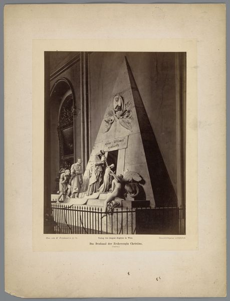 Curator: This is a photograph entitled "Grafmonument van Maurits van Saksen in Straatsburg", placing it in Strasbourg, and it dates to sometime between 1855 and 1885. It’s a gelatin-silver print. Editor: It's stark, even in this subdued rendering. The texture of the stone and fabric give a powerful weight to the memorial. I'm struck by the materiality immediately; the cool detachment implied by marble. Curator: It presents us with a history painting in photographic form, quite literally, immortalizing the memorial of Maurice de Saxe. The monument, completed in the late 18th century, embodies neoclassical ideals, and the photograph then captures it at another moment in time. There's a double layering of historical representation going on here. Editor: Look at the draping, though, those expressive gestures; and also at the very human detail in the right corner: a visitor admiring this display, which invites me to consider the social dimension of memory embedded in these artifacts. It forces me to think: Who built it and with what methods? Curator: Exactly. This monument, of course, wasn’t made in a vacuum. It speaks of power, and its legacy continues to resonate today through complex sociopolitical lenses, intersecting ideas of French identity and cultural dominance. Editor: And that power manifests not only in its scale, but also in its deliberate construction – in the quarrying, carving, and placing. Think about all of labor concentrated there, all those hours spent making that mass... Curator: Indeed. When we reflect on monuments, we must remember to interrogate the narratives that they enforce. How does it relate to larger themes of colonialism and commemoration? The question being asked through this photographic depiction of it: which histories deserve such prominent display? Editor: Ultimately, analyzing it closely, physically, reveals its symbolic density and intricate connections between aesthetics, craft, labor, and remembrance in this striking piece of photography. Curator: I find that these visual and historical layers complicate notions of authenticity and allow us to interrogate what truly lives on, whether it is an intended glorification or an accidental memorialization in a photographic artifact that persists across centuries.