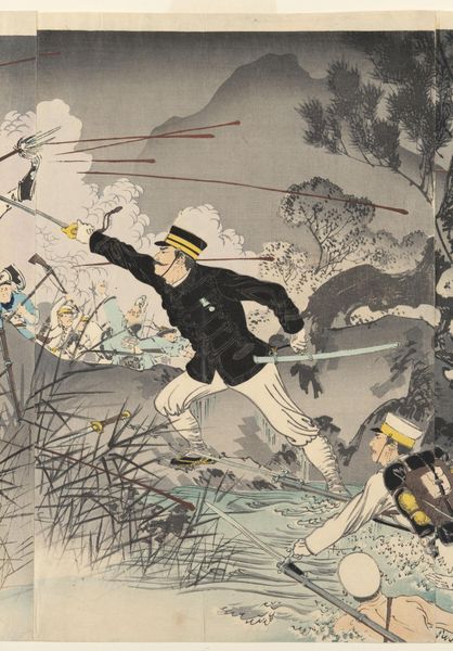 Curator: The energy is palpable! It feels like we're right in the middle of the action. Editor: Indeed. This woodblock print, created by Mizuno Toshikata, captures a scene titled "Harada JÅ«kichi was the First to Climb Up the Genbu Gate and Bravely Attack the Chinese Displaying Military Honor." Curator: The raised rifle, the fallen foe—it’s a clear symbol of dominance. But the gate itself, with its intricate designs, evokes a sense of cultural collision. Editor: The artist is invoking very specific cultural symbols to promote a narrative of military might and national pride. Consider how the image itself was circulated during times of conflict to shape public perception. Curator: And the fallen figure, with his exposed soles, presents a strong symbol of humiliation in some East Asian cultures. Editor: Precisely. The potency of these symbols lies in their ability to communicate complex ideas about power and cultural identity with a single glance. Curator: It's fascinating how a single image can hold so much social and cultural weight. Editor: Ultimately, artworks such as this one invite us to contemplate the narratives they perpetuate and the power they wield.