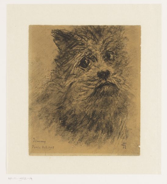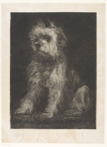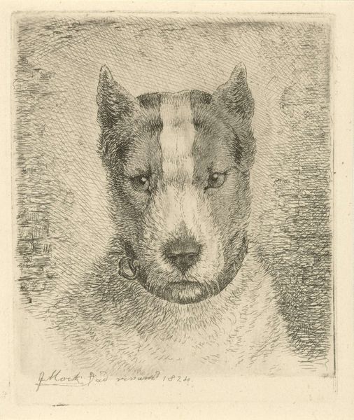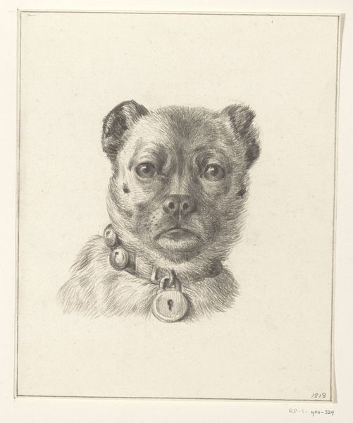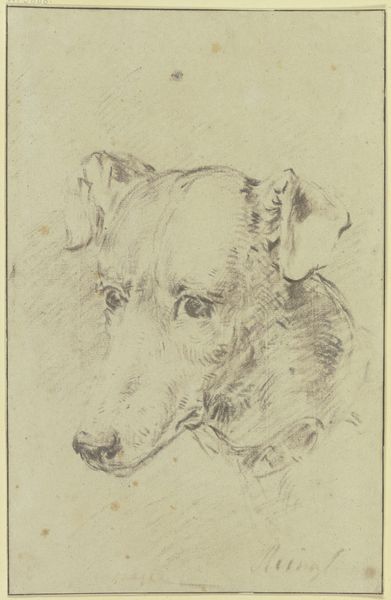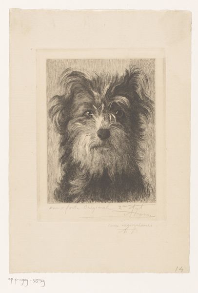 Editor: Here we have H. Berthier’s "Kop van een hond" from 1884, a drawing rendered as an etching or engraving. The detail is quite striking; it really captures the dog's...well, gravitas! What do you see in this piece, from your perspective? Curator: The gravitas you mention is palpable. Beyond the individual animal, I see a representation of power dynamics inherent in human-animal relationships of the era, and potentially, more broadly in society. The dog’s collar, seemingly innocuous, acts as a potent symbol of control and ownership. Who has power over whom, and to what ends? That's a vital question to ask of portraiture, whether human or canine. Does it matter that the dog's gaze seems averted? Editor: That's a perspective I hadn't considered. I was focused on the dog's rather stern expression. You think the averted gaze has significance? Curator: Absolutely. Does the averted gaze signify subservience, resistance, or something else entirely? Consider how such imagery intersects with Victorian-era ideologies surrounding domesticity and control. Were specific breeds chosen to depict particular meanings? Editor: Interesting... It sounds like analyzing the cultural context of this work really unlocks deeper layers of meaning beyond just a simple animal portrait. Curator: Precisely. Art, even something as seemingly straightforward as this, is rarely devoid of socio-political implication. How the image is disseminated and understood becomes part of its life, enmeshed with identity and politics. Editor: I'll certainly look at animal portraits differently now! Thinking about power and control makes you see the image itself in an entirely new light. Curator: I agree. Asking difficult questions makes engaging with the work that much more thought-provoking and rewarding.
