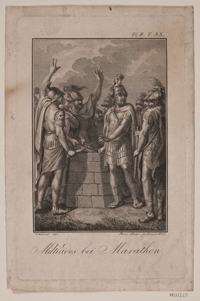 Curator: Jean Dambrun's etching, "He Returns Among his Equals," presents a stark scene. I am immediately struck by the contrast in dress and posture between the figure on the left and those on the right. Editor: It's difficult to ignore. The stark juxtaposition speaks volumes about social alienation and perhaps the precarious position of the ‘returned.’ Curator: Note the sharp lines of the architecture versus the softer rendering of the figures. This highlights the social structures that shape the character's experience, all created using the etching method of the time. Editor: Absolutely. The architecture looms as a rigid, perhaps oppressive, framework against which the individual struggles. Are we looking at a critique of power structures and their impact on those deemed 'other'? Curator: It certainly invites that interpretation. Considering Dambrun’s context in the late 18th century, the piece invites reflection on the very meaning of equality and belonging. Editor: Indeed. It pushes us to consider how these concepts were, and are, selectively applied based on social standing, gender, and race. Curator: It’s a work that uses its materials to prompt questions about social hierarchies. Editor: A powerful visual statement that reverberates even now.