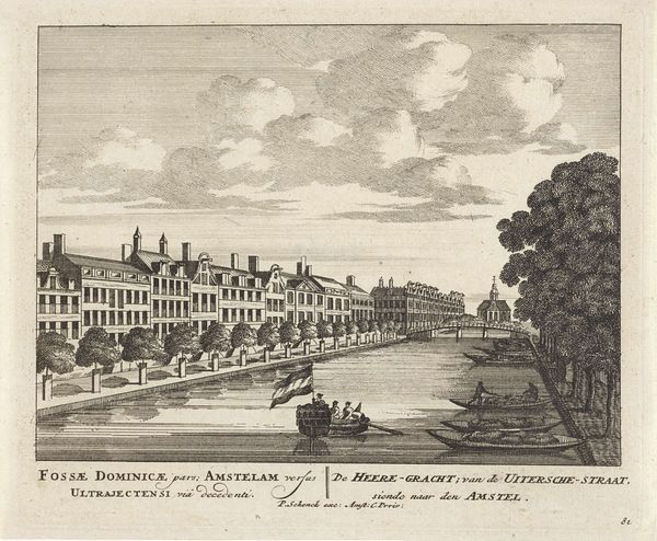 Daniël Stopendaal created this print of the Vecht near Breukelen. The composition is structured around the river, which acts as a strong horizontal axis, dividing the scene into distinct upper and lower registers. Above, the sky dominates with swirling clouds, their forms echoed in the reflections on the water below. To the left, architectural structures punctuate the landscape, their geometric shapes contrasting with the organic forms of the trees and clouds. The artist uses line work to define shapes, creating a sense of depth and distance. Consider how the print functions as a semiotic system. The built environment represents order and control, while the natural elements evoke notions of the sublime. Stopendaal's strategic arrangement emphasizes a tension between human intervention and the untouched natural world. This interplay reflects broader cultural concerns with the relationship between humanity and nature. Ultimately, the artwork invites contemplation on the constructed and perceived boundaries.