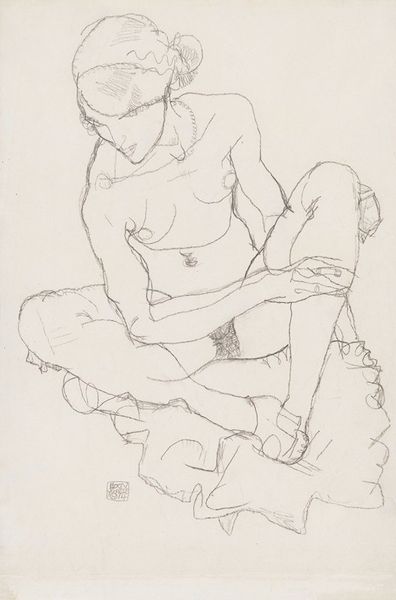 Egon Schiele made this drawing of a woman buttoning her shoes with pencil on paper. The lines are quick and raw, but they really nail the pose, you know? It's like, he's not trying to pretty things up, but instead capture the realness of the moment, the sort of zig zag quality to the lines giving the image a nervous kind of energy. You can almost feel the paper's texture. The marks are delicate, but you can see how he's gone over some lines again and again, building up the form. Look at the way he's drawn the hands, so delicate, and the shoe itself, it is so detailed. The way her body folds and twists, it's all there in these simple marks. You can tell that Schiele was interested in the process of making art, not just the end result. Schiele reminds me a little of Alice Neel, in the way that they can use the human form to tell a story, but of course Schiele’s marks have got that restless, searching quality to them. It's like he's having a conversation with himself, and inviting us to eavesdrop.