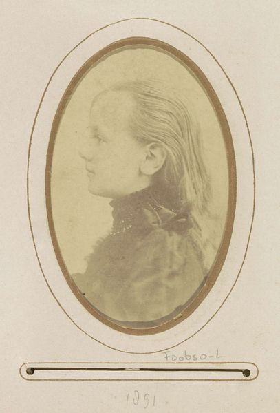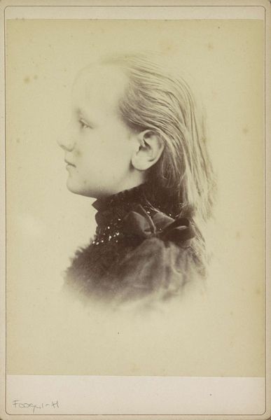 Editor: Here we have Adolphe Zimmermans' "Portret van Wilhelmina, koningin der Nederlanden, in rouwkleding," a photographic portrait from possibly 1891 to 1893. It’s on paper, a very intimate profile view. What can you tell me about it? Curator: Focusing on its materiality, it’s crucial to acknowledge the process behind this image. A photographic portrait wasn't just a click of a button back then. There were layers of labor, from the photographer’s expertise and the studio setting to the preparation of the photographic paper and the chemicals involved. The act of memorializing royalty through reproducible images was also an interesting social commentary on visibility, class, and representation. What do you think about the photographic process itself? Editor: It seems much more… deliberate? Less spontaneous, with greater investment. This must have also influenced who and what got photographed. Curator: Precisely! Photography shifted from exclusive luxury to accessible commodity over time, altering societal perspectives on who and what merited documentation. Look at the deliberate crafting of her image, down to the mourning clothes – that's powerful messaging about succession and responsibility. Consider the context: was the attire specifically ordered? What sort of resources and labor does it entail? Editor: So, viewing it materialistically encourages us to think beyond just the artistic merit of the portrait, and consider the societal implications and the manufacturing surrounding the creation of this portrait? Curator: Exactly. The very act of reproduction, indicated by "REPRODUCTIE" at the bottom, challenges our understanding of value and authenticity. Was this mass-produced, or limited edition? How did this affect its reception at the time? Editor: I hadn't thought about that aspect of reproduction. It gives a completely new perspective! Thanks for highlighting that. Curator: It’s all about examining the labor, resources, and power structures inherent in art production.