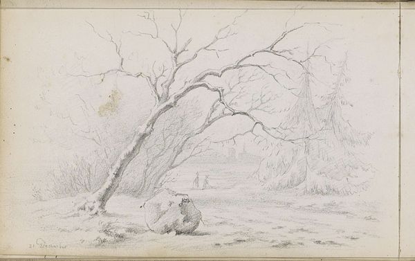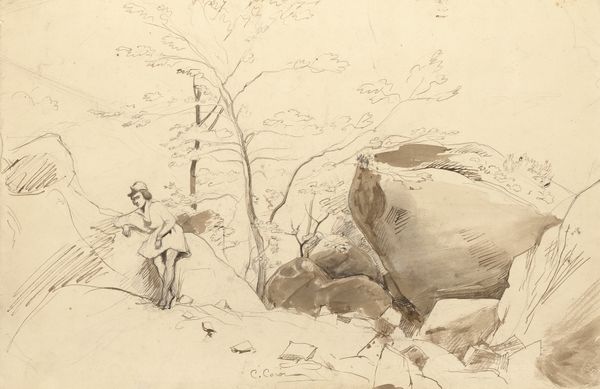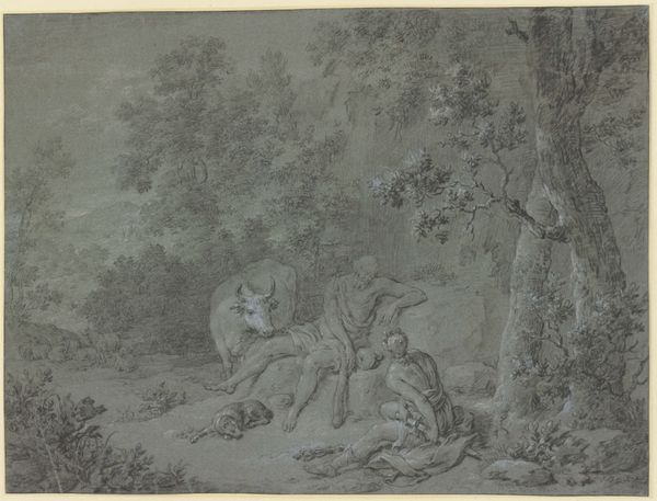 Curator: My first impression is how peaceful the scene seems; almost melancholy. There is a certain stillness to it, accentuated by the limited tonal range of the pencil. Editor: Indeed. This work, attributed to Johannes Tavenraat, bears the title "Sitting Hunter on a Country Road." Created between 1843 and 1844, it's now held within the Rijksmuseum’s collection, offering insight into the intersection of genre painting and the romantic landscape tradition. Curator: It certainly seems to fit within that framework. The soft lines and gentle shading create a wistful feeling. Notice how the landscape is more suggested than fully rendered, leaving space for the viewer's imagination to wander. I am captivated by how Tavenraat manages to convey so much emotion with what is ostensibly a preliminary sketch. Editor: These works often provide unguarded insight into the working practices of artists. Genre paintings, which this drawing exemplifies, were gaining popularity, reflecting a shift toward depicting everyday life. Consider, too, how hunting had long served as a symbol of status, transitioning towards a leisure activity embraced by the middle class as well. Curator: Good point! I am immediately drawn to the contrast between the stillness of the seated hunter and the implied motion of the hunt itself. It’s as though Tavenraat is capturing a moment of quiet contemplation amid a more active pursuit. Observe the position of his dogs, some clearly exhausted and asleep after the pursuit, near the hunter. It appears there's a certain connection and respect here being represented. Editor: The artwork definitely shows the changing attitudes during the period, as artists and audiences looked to redefine established cultural practices and how this connects back to a new understanding of natural landscape. Curator: And how these personal scenes are imbued with broader social meaning. This quick pencil drawing is anything but simple. Editor: Agreed, quite interesting to see how a quick medium is used to address many ideas within that specific period.